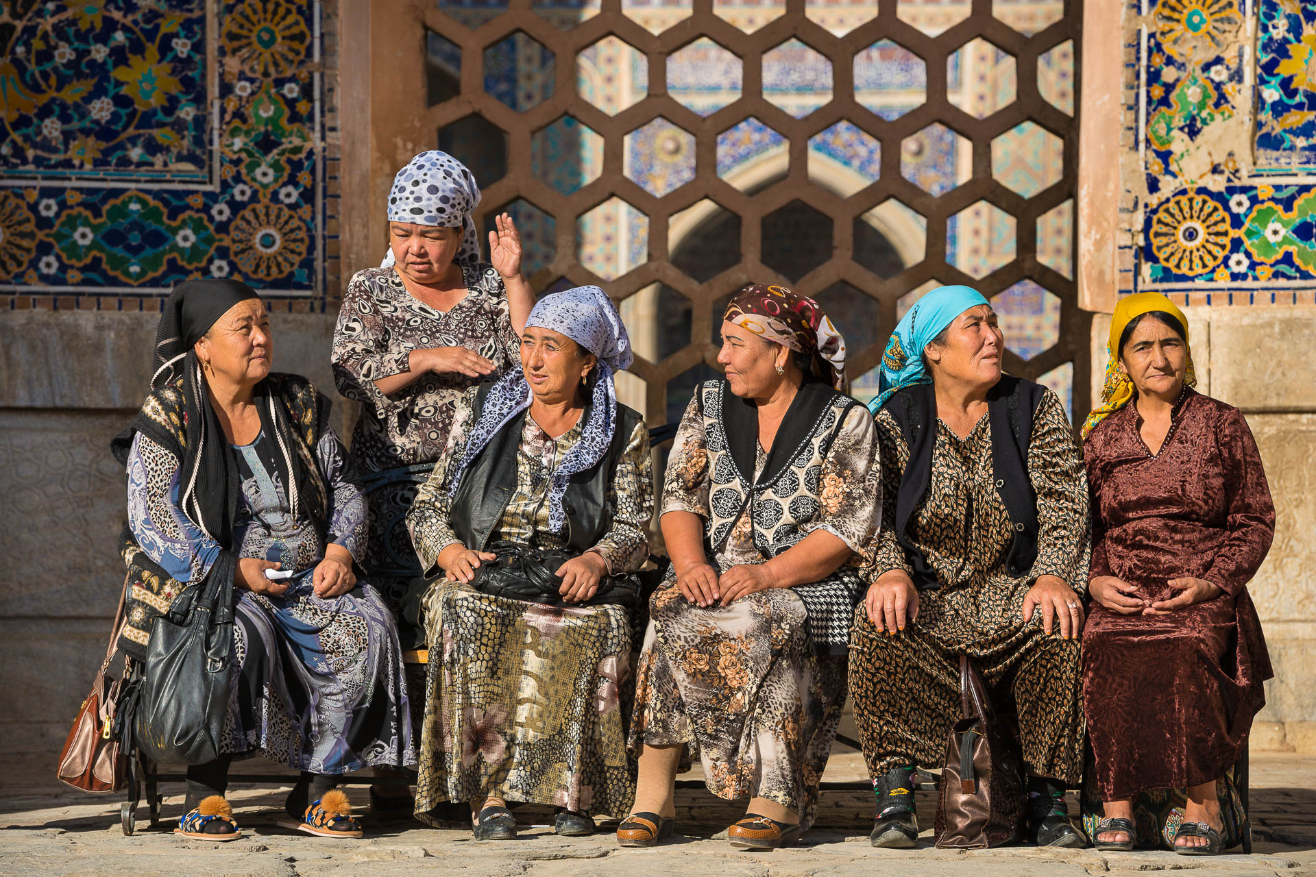 Ouzbèkes devant la médersa Sher-Dor à Samarcande en Ouzbékistan © Marc Dozier