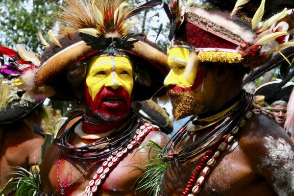Nous assistons au Goroka Show, le grand sing-sing de Goroka, ainsi que la veille, à un Paiya Show. Au cours de notre voyage, nous rencontrons d’abord différents peuples papous au fil des régions visitées : Abelam et « hommes-crocodiles » du Sépik, puis les « hommes-plumes » des Highlands. Nous sommes en immersion, avec des sing-sing, danses et activités locales. Si les conditions le permettent, extension possible vers les montagnes de Simbai en vol chartérisé, avec participation au grand festival annuel du peuple kalam, aux étonnantes coiffes à base de scarabées dorés. Extensions possibles aussi vers les îles de Nouvelle-Irlande et Nouvelle-Bretagne, et dans la région isolée de Tari, les « hommes-perruques » Huli.