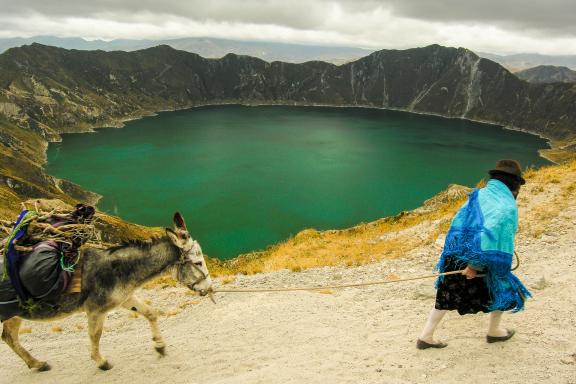 Court transfert au village de Zumbahua, environné de pics, et du patchwork de cultures typique de la montagne équatorienne. C’est le jour du marché hebdomadaire, où les paysans amènent leurs marchandises à dos de lamas. Dans ce marché de montagne typique, divisé en plusieurs petits marchés, on vend fruits et légumes, vêtements, animaux (lamas, chevaux…), ainsi que divers objets d’artisanat. Route vers le village de Quilotoa, perdu en plein paramo andin. Tout près se trouve le volcan du même nom, dont la caldeira est occupée par un lac aux eaux sombres. Nous descendons dans le cratère volcanique, dont la couleur varie entre le bleu turquoise et le vert émeraude en fonction de l'orientation des rayons du soleil. Par beau temps, on peut admirer au loin les volcans Ilinizas et même le Cotopaxi. Route vers le sud en direction de la charmante petite ville thermale de Baños, dominée par des hautes montagnes verdoyantes.