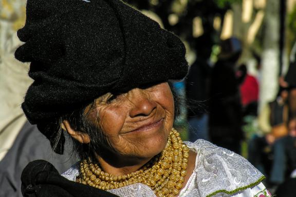 Otavalo fut un carrefour marchand dès l’époque préinca. On y tissait le coton de la côte pacifique, et la laine des lamas. Les tissus étaient vendus dans toutes les Andes du Nord, jusqu’en Colombie et au Pérou. Sous la domination inca au XVe siècle, Otavalo est devenu un centre administratif important, de nouvelles cultures ayant été introduites dans la région. La conquête espagnole brisa le système traditionnel. Elle mit en place le système des « obrajes », de grands ateliers de tissage, avec des objectifs de production forcés. La population otavaleña, lourdement taxée, se vit souvent contrainte de travailler dans l’obraje de Rodrigo de Salazar, un conquistador particulièrement avide, qui employait des centaines de travailleurs, et faisait produire une grande partie des textiles de l’Amérique du Sud coloniale. L’Indépendance, puis la réforme agraire, ont permis aux Otavaleños de reprendre en main leur destin, et d’exporter leurs textiles dans le monde entier. Ils sont aujourd’hui les Indiens les plus prospères d’Équateur et de redoutables commerçants ! Nous visitons aujourd’hui leur célèbre marché : ils portent toujours leurs vêtements traditionnels : poncho bleu, chapeau de feutre brun, et cheveux longs en queue de cheval pour les hommes ; jupe noire et corsage blanc brodé, ainsi que de nombreux colliers de perles dorées pour les femmes. Court transfert vers la magnifique lagune de Cuicocha, de son ancien nom Kichwa Achikkucha, littéralement la lagune des Dieux, au pied du volcan Cotacachi (4 939 m) à 3 400 m d’altitude. Au centre de l'ancien cratère se trouvent deux îlots mythiques, Wolf et Yerovi, couverts de végétation, issus des éruptions volcaniques successives. Randonnée sur la crête qui contourne la lagune: à une altitude moyenne (3 000 m – 3 480 m), le sentier nous permet de découvrir une flore magnifique et variée. Nous jouissons de belles vues sur les dômes volcaniques des îles. En fin d'après-midi, nous visitons la ville de Cotacachi, réputée pour le travail sur le cuir et la qualité de ses articles de maroquinerie. Le cuir de Cotacachi est exporté dans le monde entier. Retour à San Clemente, pour un dernier repas et une dernière nuit dans la communauté.