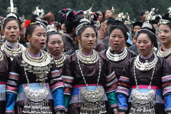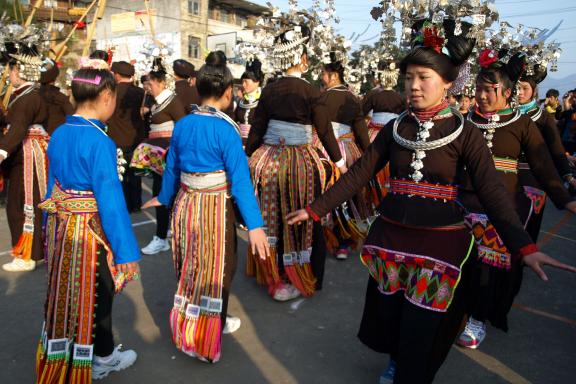 D’une vallée à l’autre, de l’Ouest à l’Est du Guizhou, chez toutes les ethnies, il y a des combats de buffles, des danses, on fait chanter le Lusheng, sorte de grand orgue à bouche, dont certains peuvent atteindre plus de 2 mètres de hauteur chez les Miao. Les filles dansent, faisant tinter l’argent qui ruisselle sur leurs magnifiques habits de fête. Lors des fêtes, les femmes Miao peuvent porter des quantités de bijoux d’argent, les transformant en véritables princesses. Ces fêtes offrent aussi de très bonnes occasions aux jeunes de se courtiser.