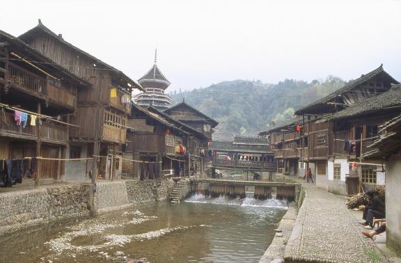 Zhaoxing est un beau village Dong bien connu, traversé par des petits canaux et ruisseaux entre lesquels s'activent les artisans : vanniers, tisserands… Nous sommes au coeur du pays Dong, surnommé poétiquement la « Mer des chansons », avec une superbe architecture traditionnelle en bois, notamment les splendides « ponts de la Pluie et du Vent » et les « tours du Tambour », qui sont d’étonnants édifices en bois ouvragé typiques de cette ethnie. Il y a cinq tours du Tambour à Zhaoxing, édifiées par chacun des cinq clans du village.