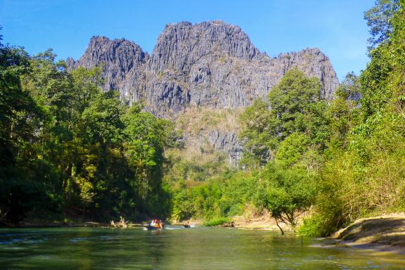 Nous partons en pirogue sur la rivière Hin Boun, parsemée de reliefs karstiques et de forêts, dans la zone protégée du Phou Hin Boun. La rivière traverse cette montagne par un long tunnel rocheux de 7 à 8 km.