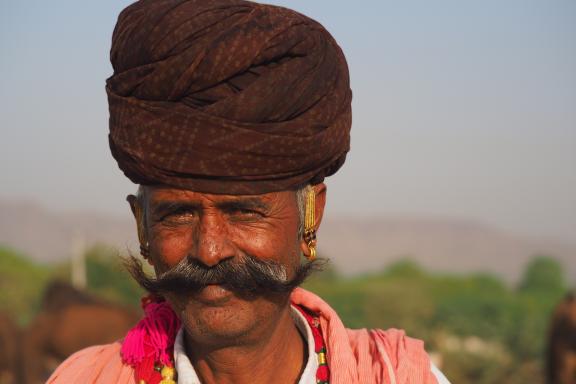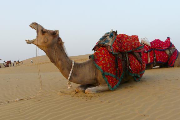 Pour la randonnée chamelière, nous sommes accompagnés par des dromadaires pour assurer le portage et nos chameliers se transforment en musiciens le soir autour du feu. Nous traversons des villages et des hameaux isolés où la population est des plus accueillantes. En effet, le désert de Thar est un des déserts les plus « peuplés » du monde. Ce désert n’est semblable à aucun autre, et surtout pas à l’idée que chacun peut se faire du désert. Il y a quelques zones de petites dunes, mais il y a un peu partout des arbustes et même des cultures. Nous rencontrons de nombreux bergers rajpoutes et bishnoï, dont les maisons en torchis sont couvertes d’un toit de chaume. Leurs greniers à grain et leurs clôtures circulaires d’épineux ressemblent fortement aux villages africains du Sahel. La population vit de culture par irrigation et d’élevage. Le dromadaire est le moyen de transport le plus utilisé par la population locale, car il permet de parcourir les grands espaces du désert de Thar. C'est une belle expérience mélangeant randonnée dans le désert et découverte de la culture des bergers rajpoutes et bishnoï.